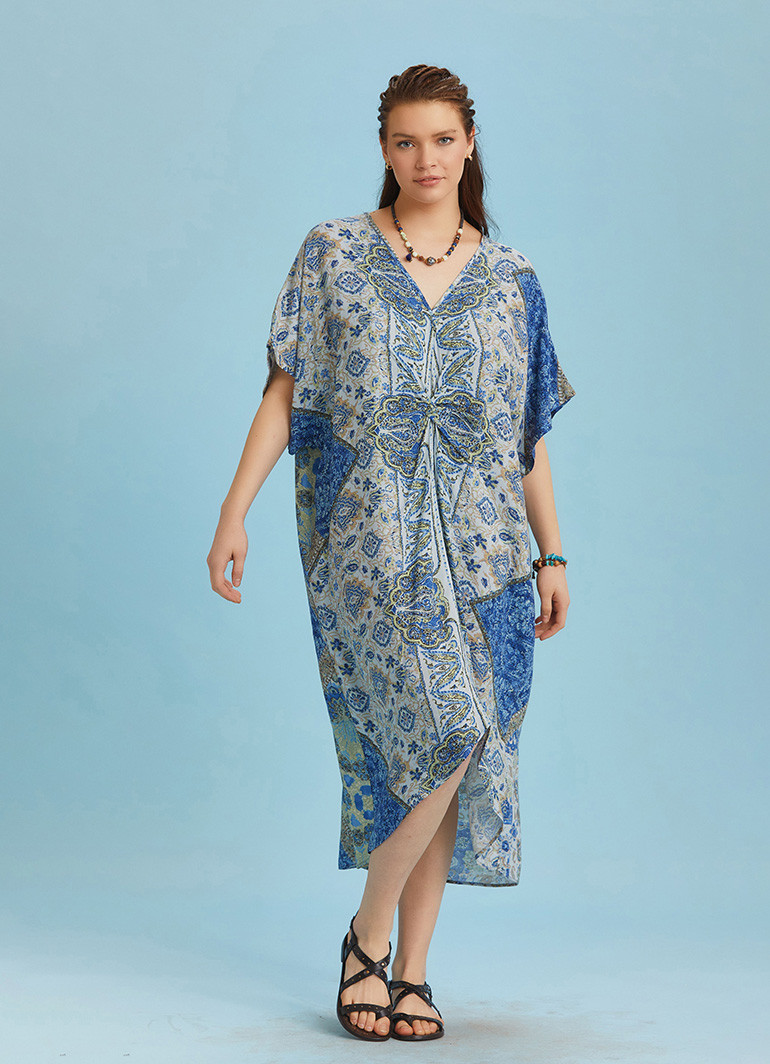 V Neckline, Twist Front Detail, Loose Fit, Half Bat Sleeves, Long Dress